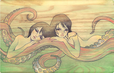 Audrey Kawasaki, oriunda da Coreia do Sul e radicada mos Estados Unidos. Técnica: Pintura a óleo sobre madeira. Muitos quadros resultam da parceria com a artista Stella Im Hultberg ( a apresentar no próximo post ). A textura da madeira como elemento de fundo - umas vezes realçada, outras dissimulada - é complementada com o traço de contorno e a profundidade de campo daí resultante é soberba.